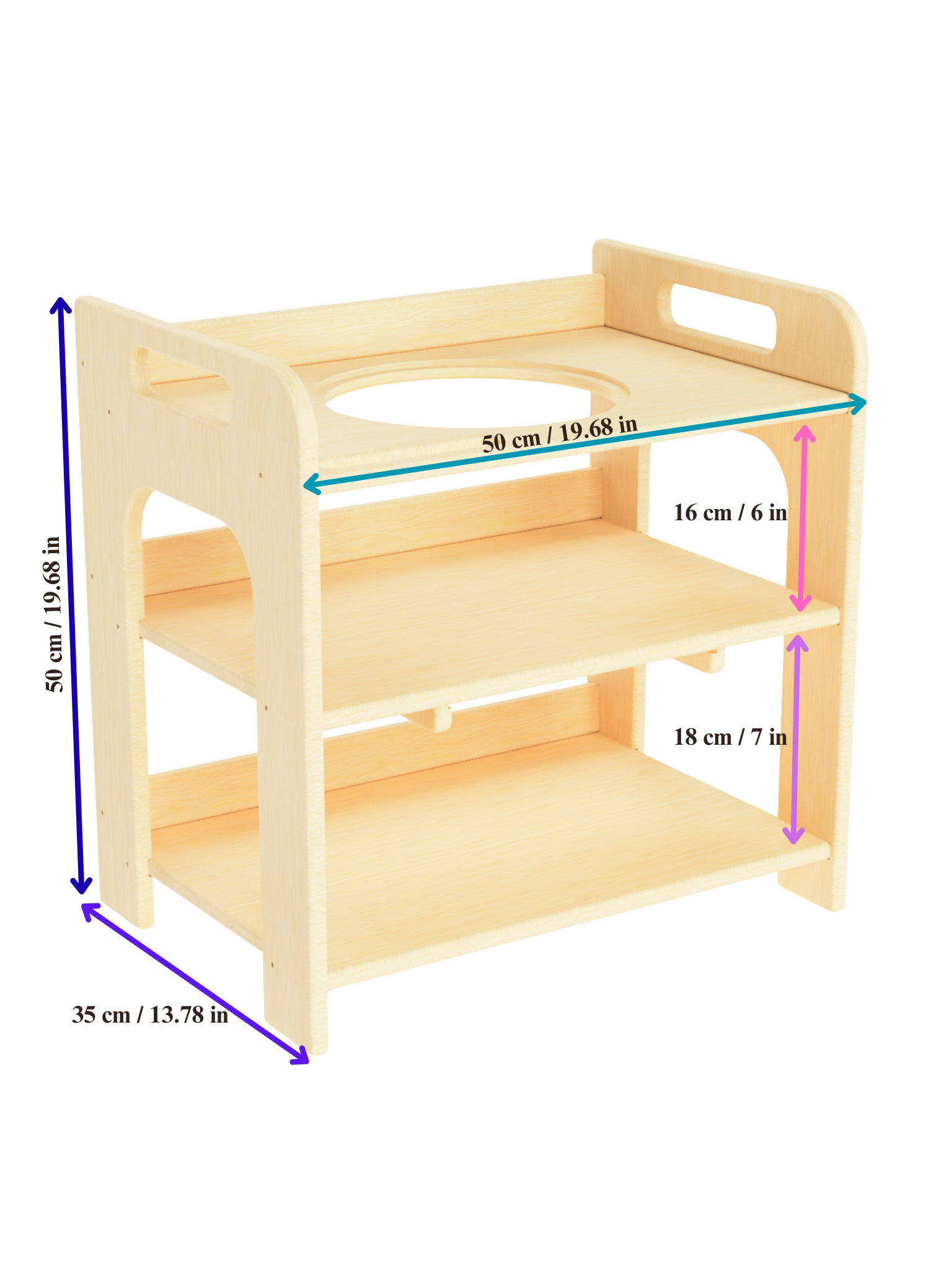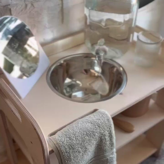 Designed for self-care activities, this washstand encourages young children to take part in daily hygiene tasks in a calm and child-friendly way — whether at home, in nature, or in a Montessori-inspired environment.