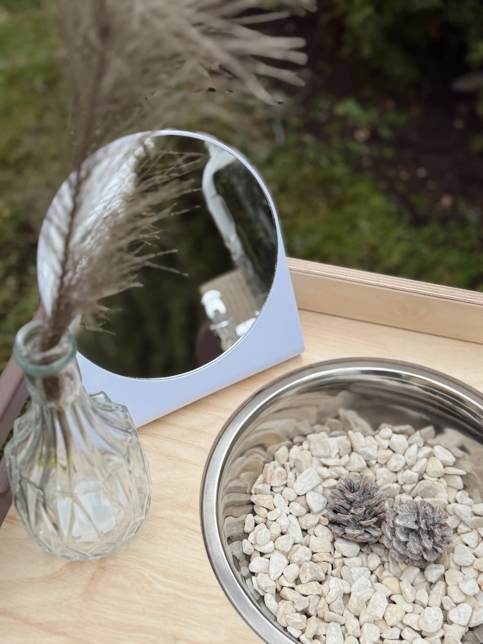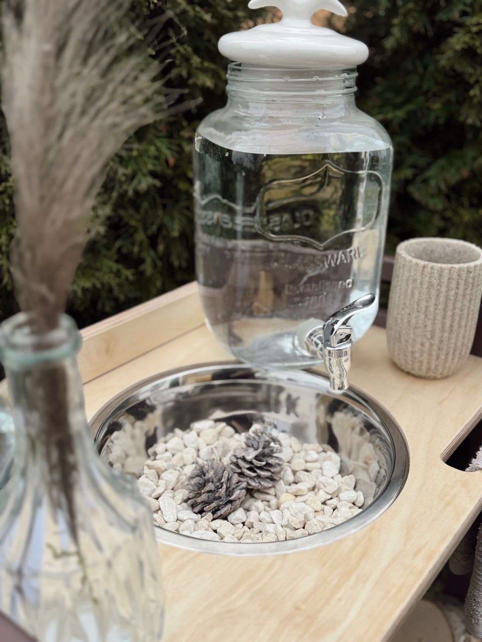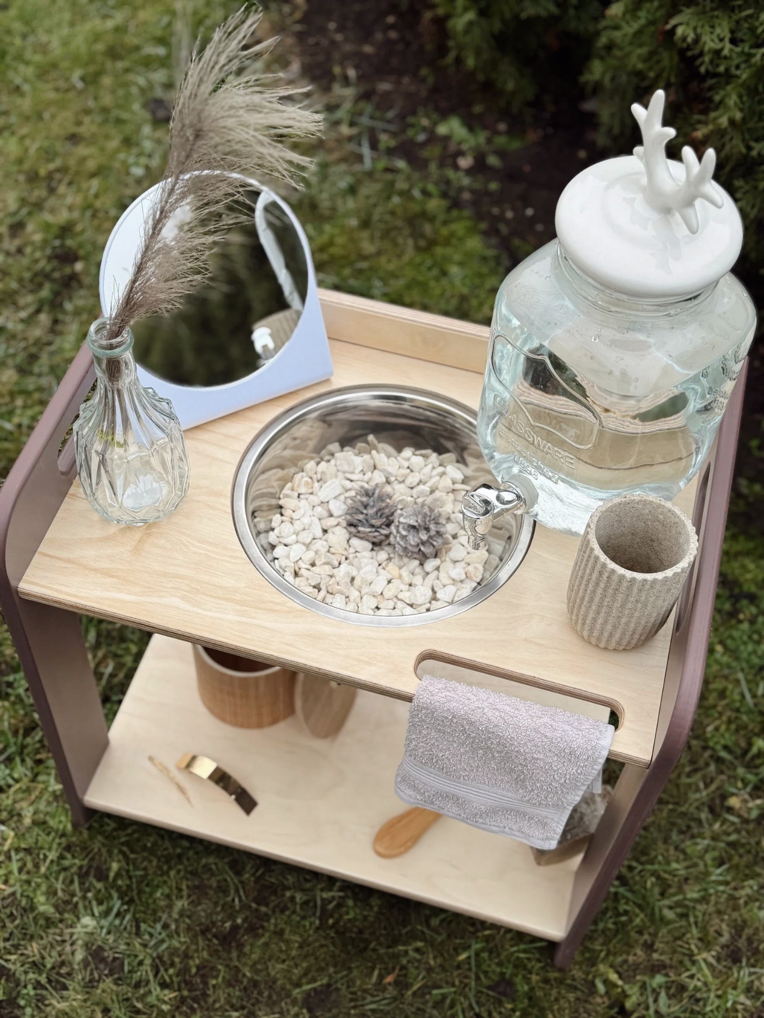 Designed for self-care activities, this washstand encourages young children to take part in daily hygiene tasks in a calm and child-friendly way — whether at home, in nature, or in a Montessori-inspired environment.